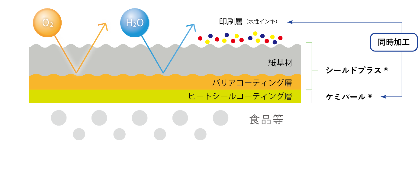 この度3社で提案する『フレパックONE』は、日本製紙が開発したバリア紙「シールドプラス®」を基材とし、最新フレキソ印刷機による高品質な印刷とヒートシール塗工を1パス加工することで実現した「バリアヒートシール塗工紙」です。環境対応が求められる包装市場における新たな環境配慮型紙パッケージとして、食品包装を中心に国内外への提案を進めてまいります。 |